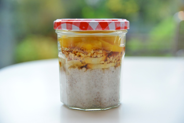 I am also testing a “to go” version, perfect for office workers or teens with early morning sports training. I made a quarter recipe of the porridge in a jam jar, then added bananas, honey, nuts and mango.