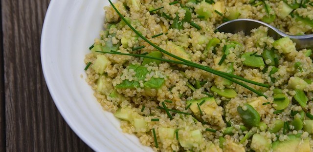 Peel and dice the avocado and cucumber, and combine in a bowl with the broad beans and quinoa. Whisk together the oil and vinegar with a bit of salt and add to the salad. Sprinkle chopped chives on top and serve.